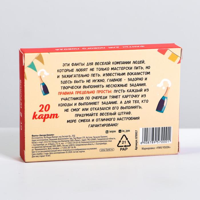 Купить игра для компании "фанты звезда бокала" 20 карт от 120 руб. с доставкой до пункта выдачи в Дедовске. Интернет магазин ДекаМаркет. Оплата при получении.
